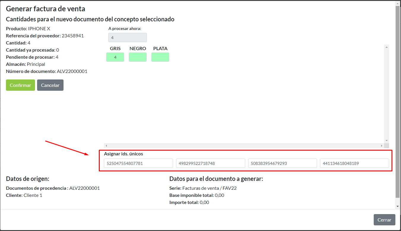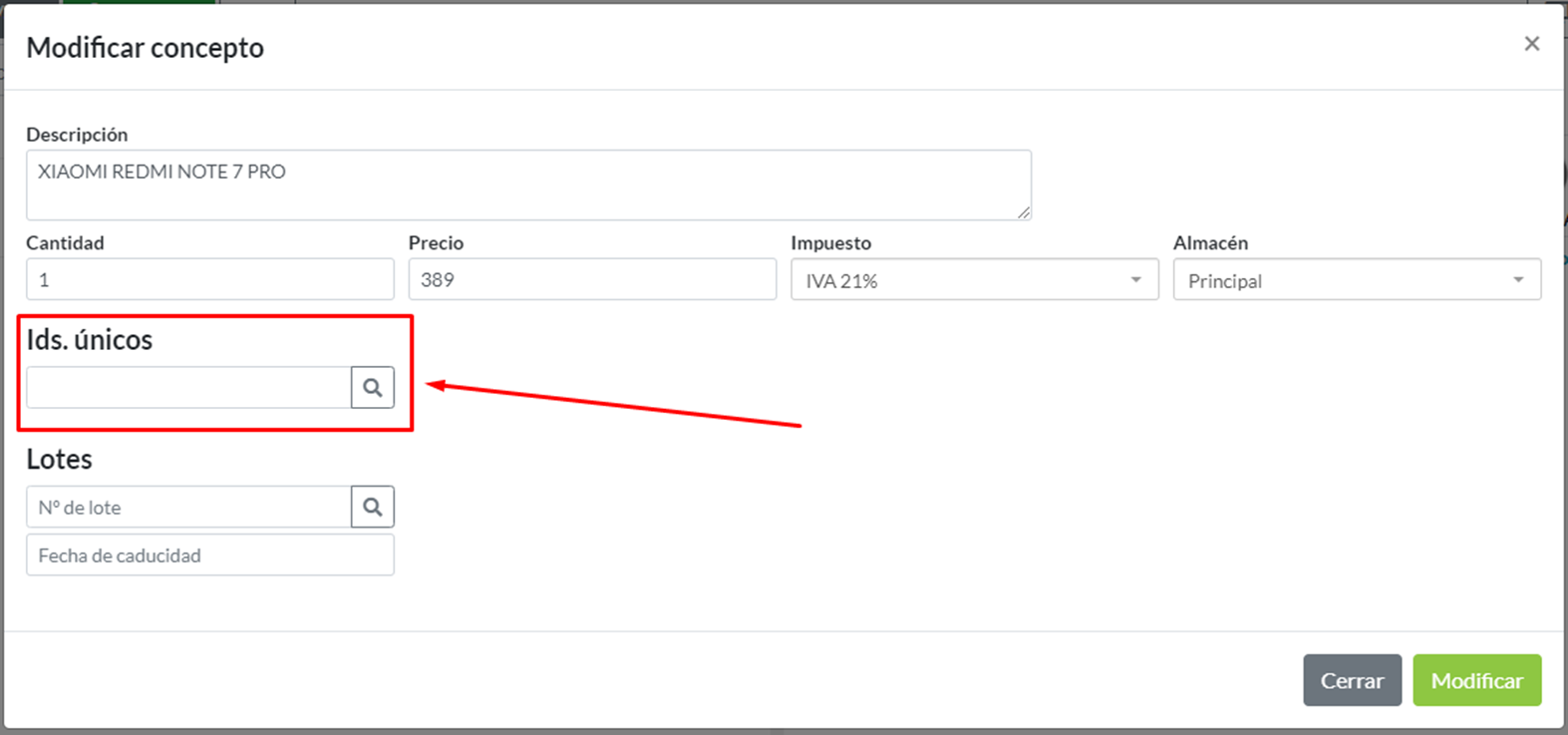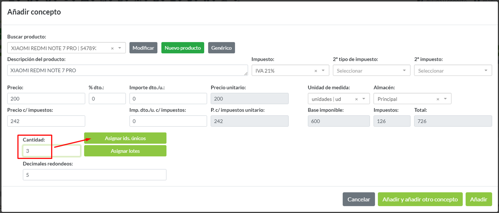 Al añadir el concepto en el documento, se debe indicar la cantidad de productos y pulsar sobre Asignar ids. únicos.