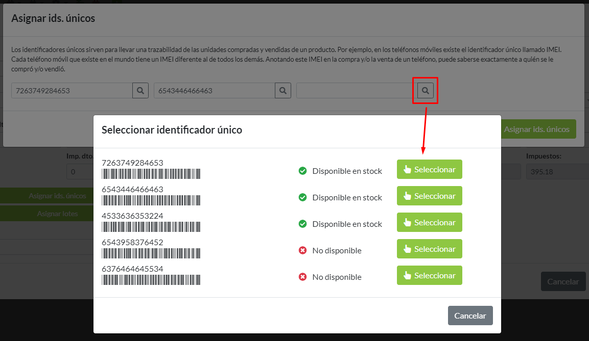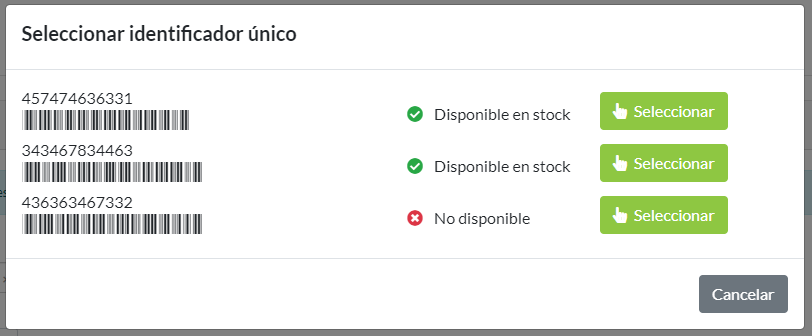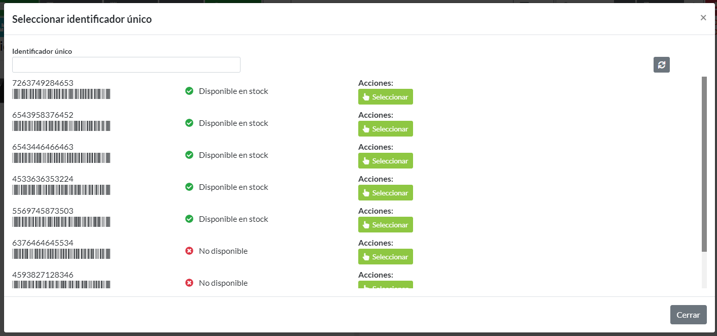 Cada uno de estos campos cuenta con un botón de búsqueda para poder acceder al listado de identificadores únicos registrados en el sistema para ese producto. En el listado se detalla el número del identificador con un código de barras y el estado de stock actual, y con un botón para seleccionar el identificador y asociarlo al movimiento de entrada o salida.