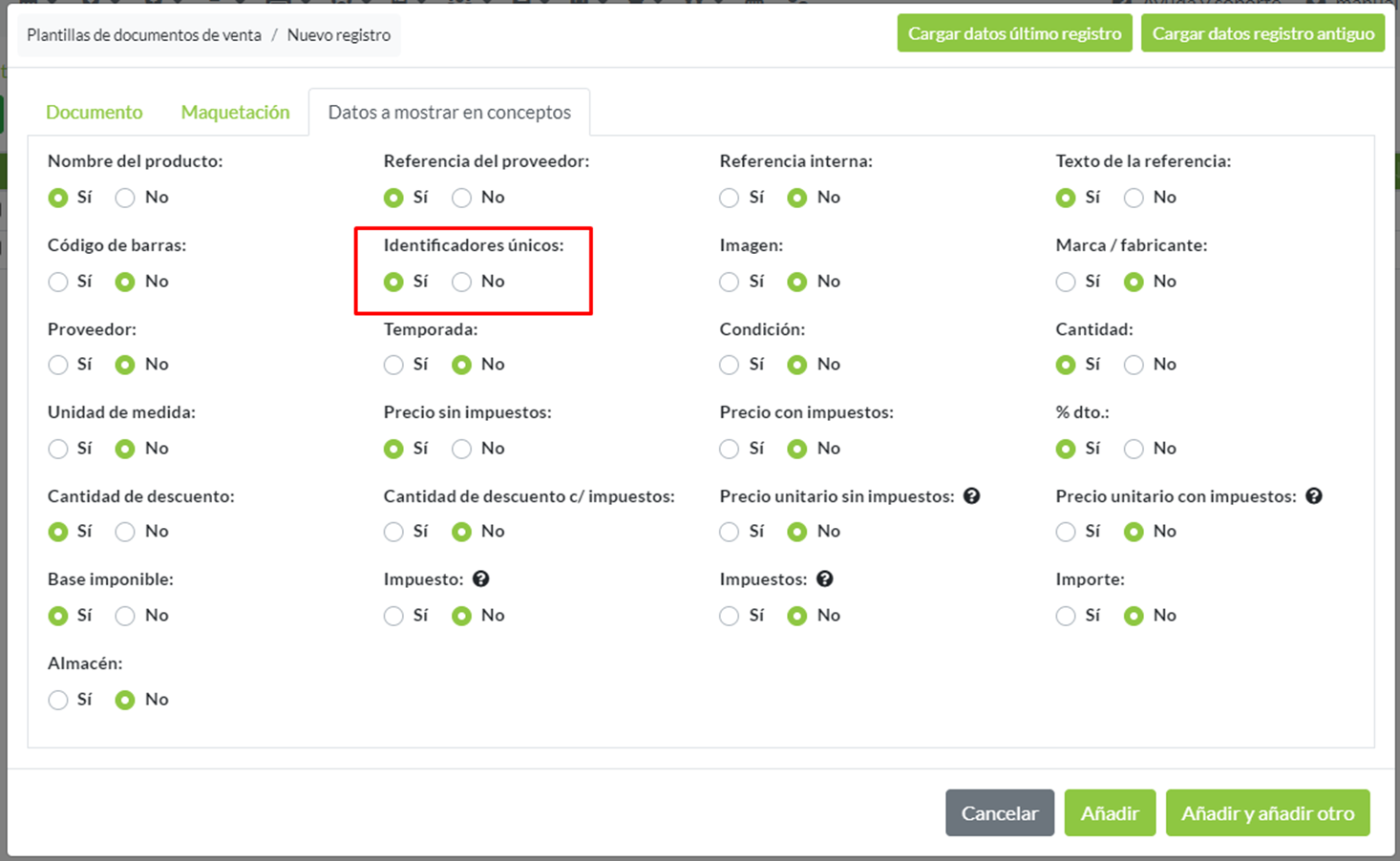 En la configuración de plantillas de documentos, tanto para compras como para ventas, puede indicarse la visibilidad de información para cada concepto. Los identificadores de cada producto pueden ocultarse o mostrarse en el detalle del documento, seleccionando Si o No en el campo Identificadores únicos de la pestaña Datos a mostrar en conceptos.