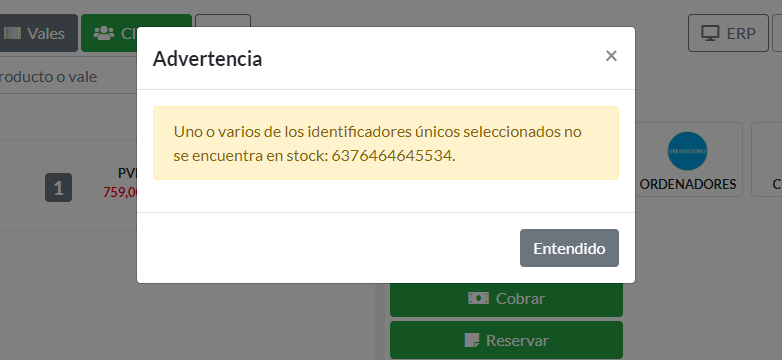 También se mostrará este mensaje si se escanea un identificador que no esté en stock directamente, desde el campo de escaneo de códigos de barras de la pantalla principal del TPV.