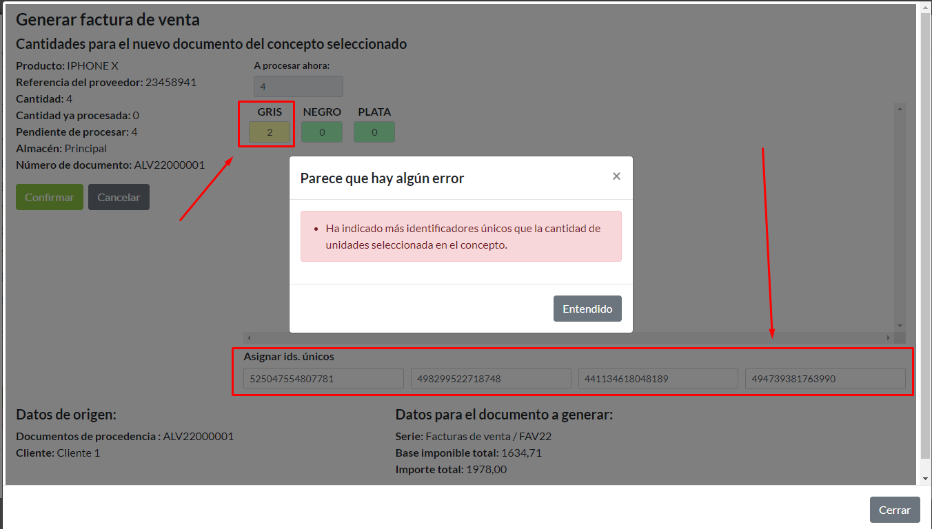 En caso que falte algún identificador, o que no se haya indicado ninguno, se mostrará un mensaje de error informando sobre el concepto exacto donde es necesario introducir los identificadores correspondientes, y no se podrá continuar hasta no indicar todos los identificadores para cada unidad del producto incluida en el concepto.