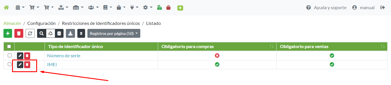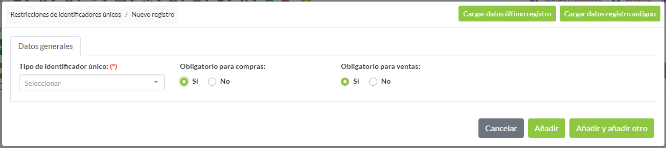 En este apartado, el programa permite crear configuraciones para que, a la hora de comprar y/o vender un producto con un tipo de identificador único específico, indicar que sea obligatorio introducir el identificador único para cada unidad.