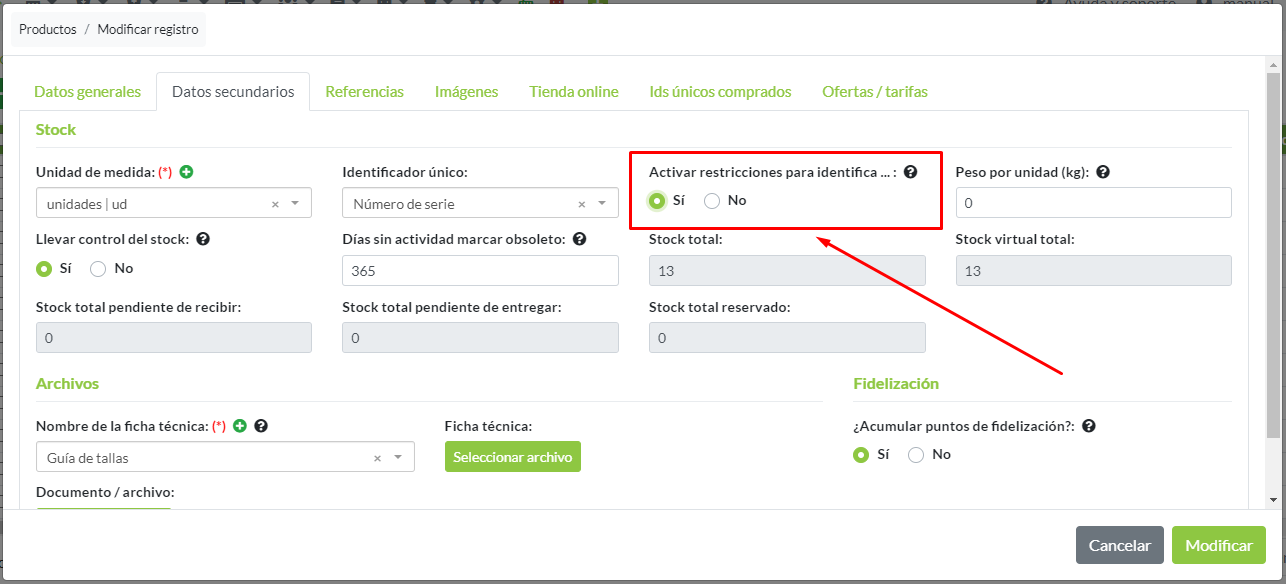 Al indicar este campo como Sí, en el momento que se registre un documento de compra o venta donde se incluya este producto en sus conceptos, se comprobará si el tipo de identificador único asignado al producto tiene alguna restricción para introducir el identificador único.