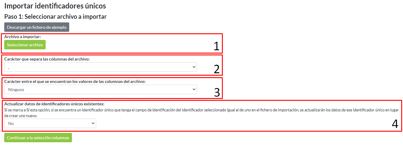 - Actualizar datos de identificadores únicos existentes: Si se marca a Sí esta opción, en lugar de crear un nuevo registro, se actualizarán los datos de aquellos identificadores únicos que tengan el campo de identificación del identificador seleccionado, igual al de uno en el fichero de importación.