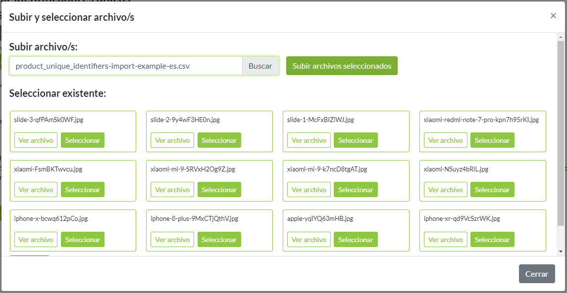 - Cuando finalice la carga, el archivo estará visible en la lista Seleccionar existente.