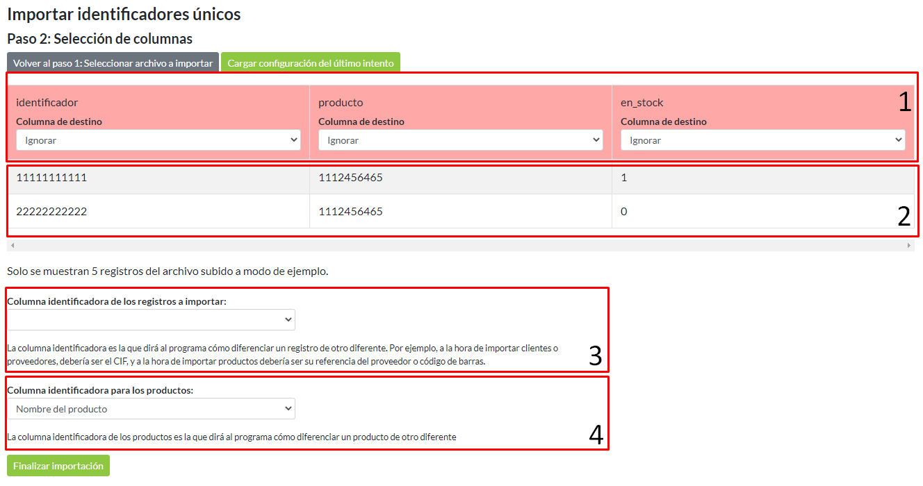 - Selección de columna que se debe utilizar como identificador único de cada registro de producto indicado en el fichero.