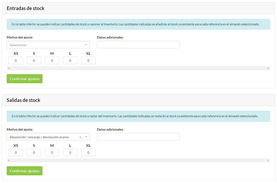 El proceso de Inventario y etiquetado de productos cuenta con la opción para indicar manualmente las entradas y salidas de stock , lo que permite registrar el incremento o decremento de las unidades de un producto, con un motivo específico detallado.