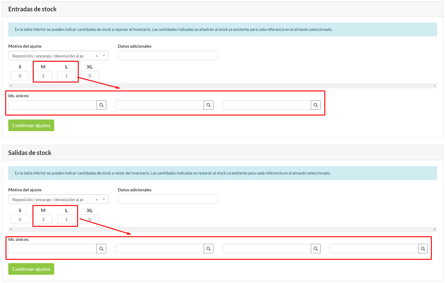 Con el módulo de Trazabilidad las opciones de estos apartados se amplían, ya que, según la suma de unidades totales que se indiquen, el formulario cargará tantos campos como total de unidades se hayan indicado, para poder indicar en ellos los identificadores únicos afectados en el movimiento de entrada o salida.