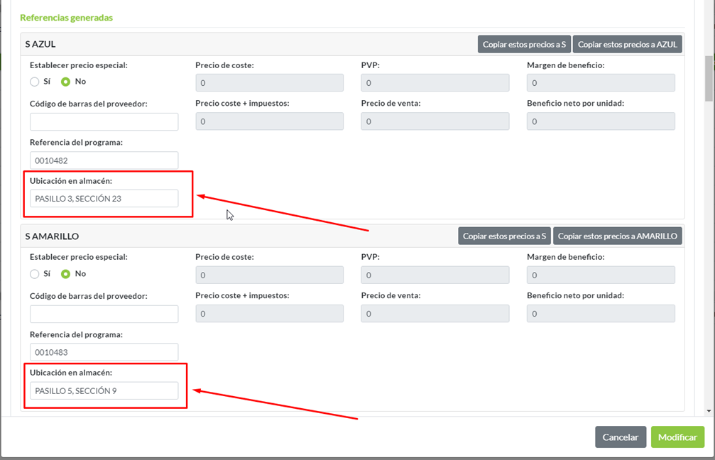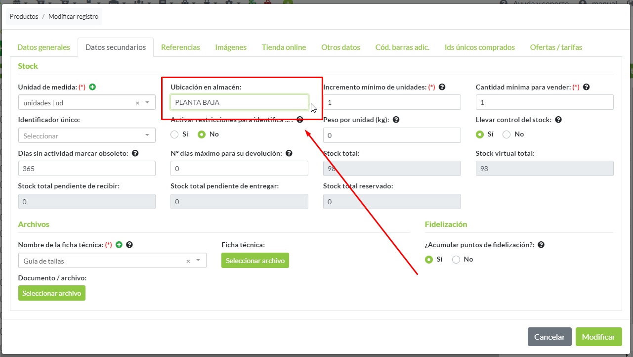 Al crear o modificar un producto y/o sus referencias, se puede indicar con un texto su ubicación en el almacén.