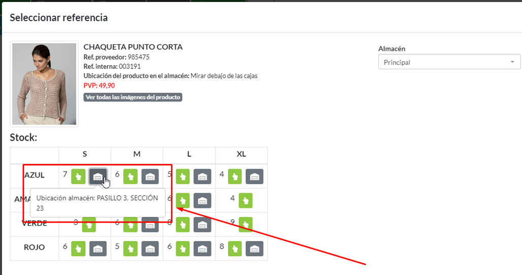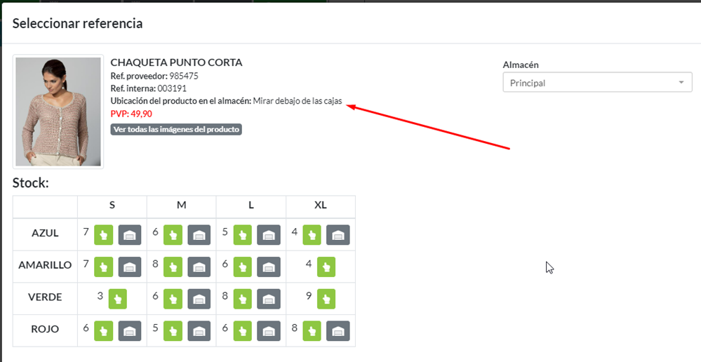 Además, cada referencia que tenga indicada una ubicación tendrá un botón adicional con el icono de almacén. Al hacer clic sobre ese botón, se mostrará el texto indicado para la ubicación de esa referencia.