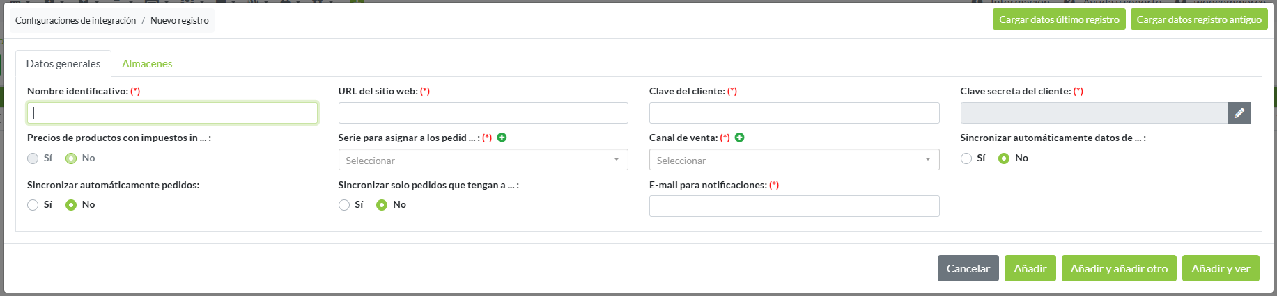 Para crear una nueva configuración de integración se debe indicar una serie de datos: