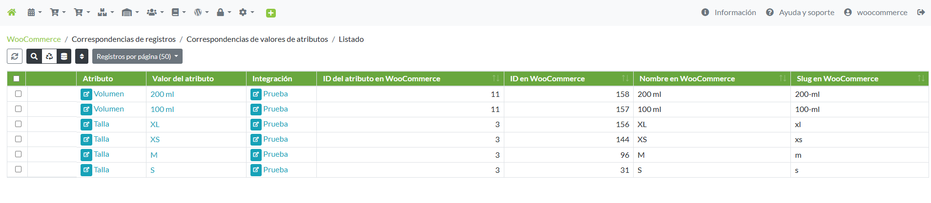 Se pueden ver los valores de atributos vinculados entre ambas plataformas en WooCommerce -> Correspondencias de registros -> Correspondencias de valores de atributos.