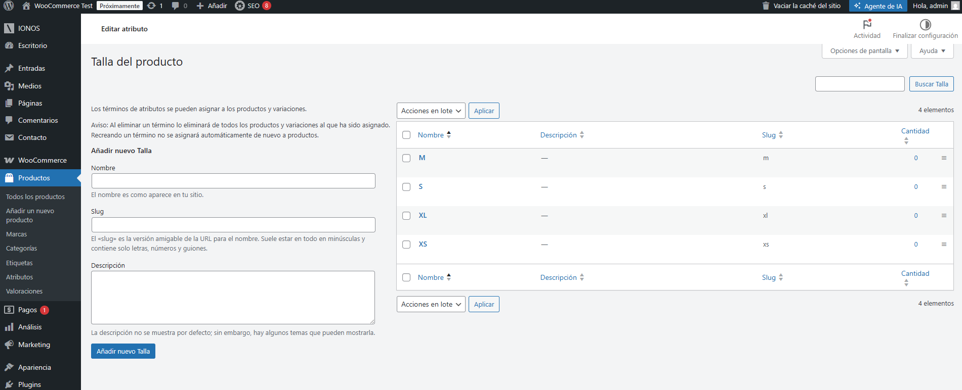 - Crear, modificar o eliminar un atributo completo: se crean, modifican o eliminan sus valores de atributos en WooCommerce.