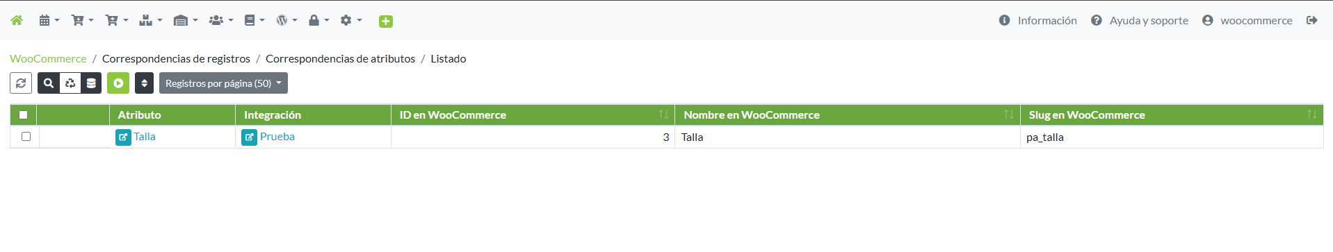 Se pueden ver los atributos vinculados entre ambas plataformas en WooCommerce -> Correspondencias de registros -> Correspondencias de atributos.