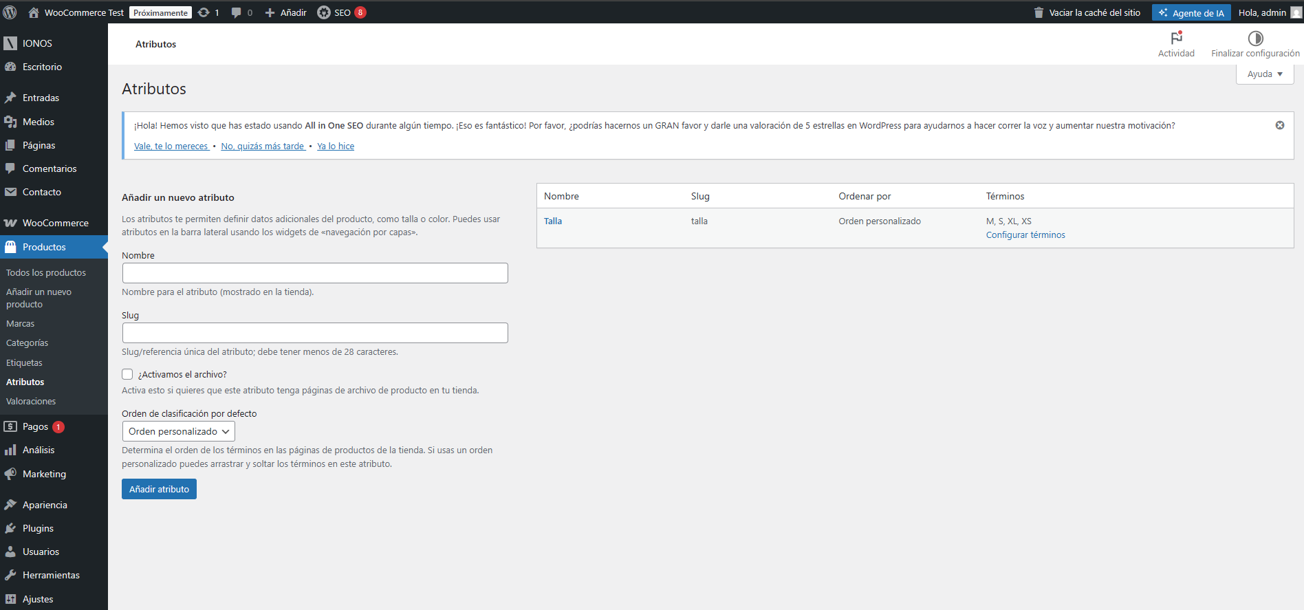 - Crear un nuevo atributo: se crea el registro en WooCommerce.
