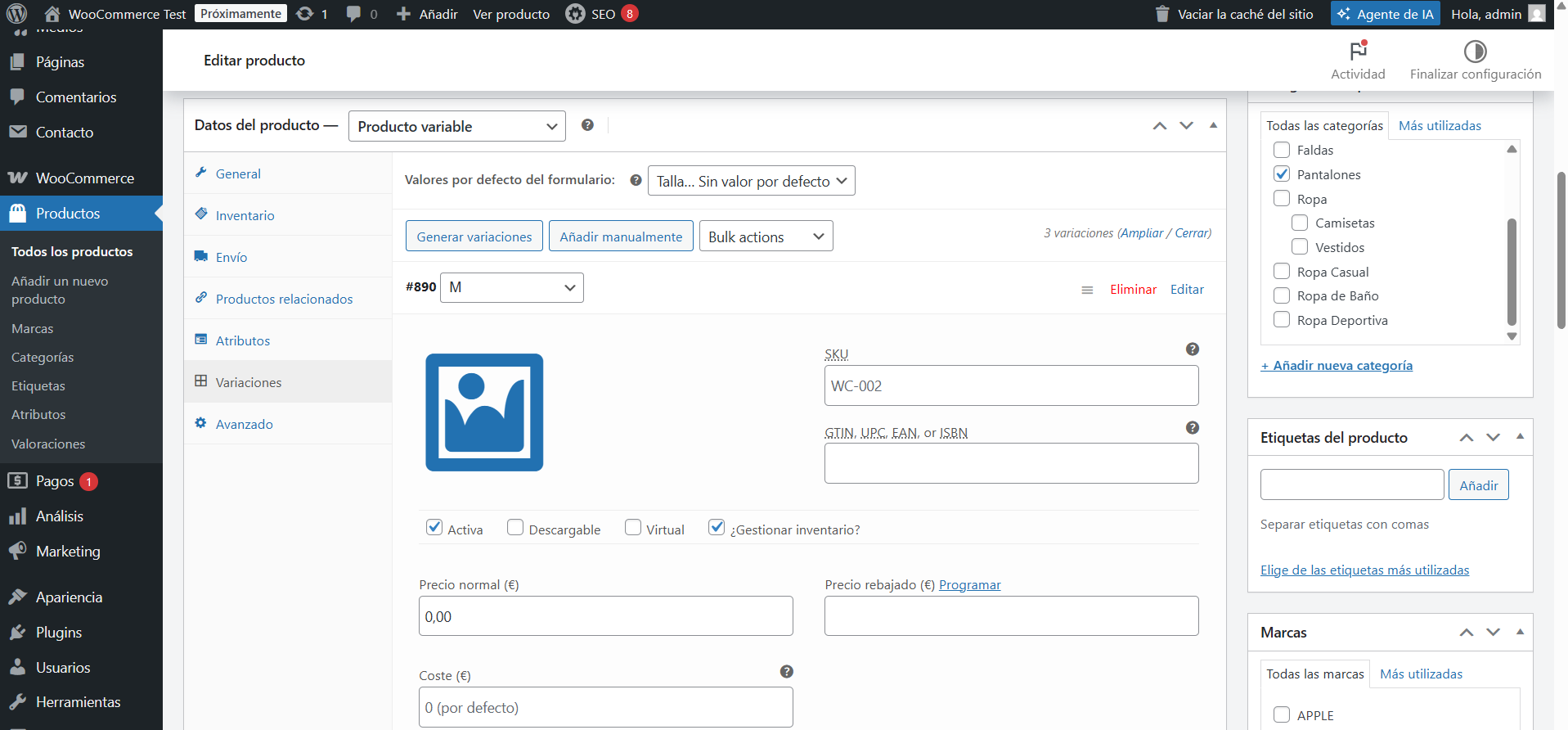 - Modificar un producto: se modifican sus referencias (variaciones) en WooCommerce.