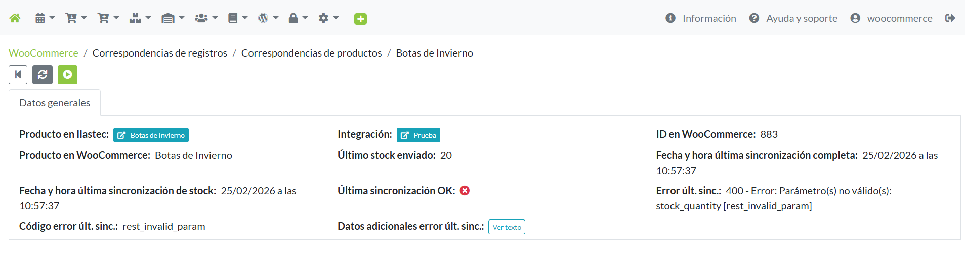 Aunque un error de sincronización en una o varias referencias no paraliza la sincronización, es de extrema importancia revisarlo y, en última instancia, eliminar el producto en WooCommerce y volver a sincronizarlo.